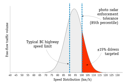 Under current BC speed limits, safe drivers are included within the red enforcement zone (the fastest 15% of vehicles). Speed enforcement should only target the top 2-5%.